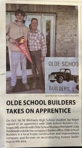 EASTON — Olde School Builders, a local home construction and improvement company, welcomed its first ever apprentice last week.